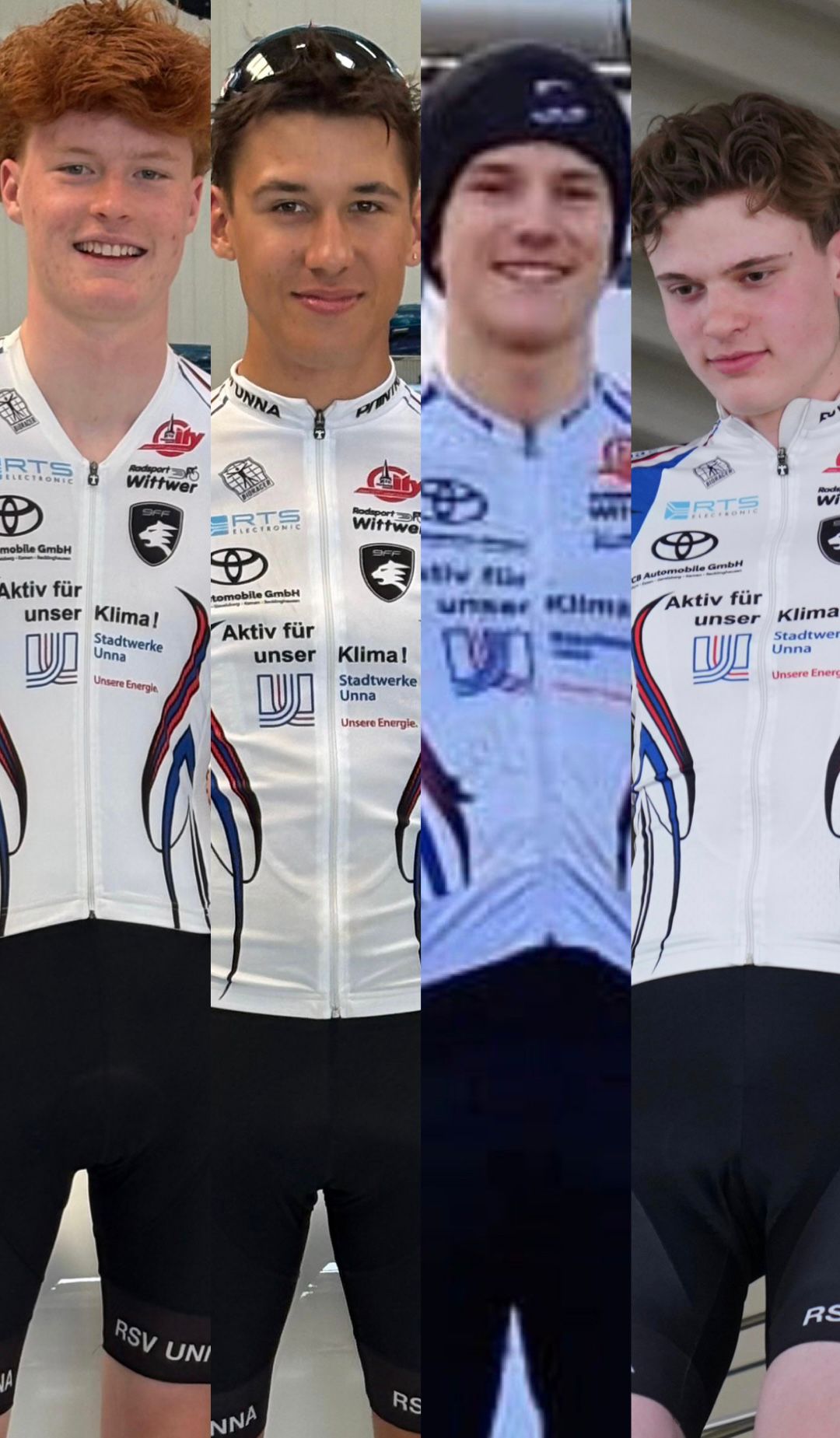 Unna. Viel Bewegung ist zurzeit bei den aktiven und ehemaligen Nachwuchsfahrern des RSV Unna. Weniger körperlich als vielmehr teammäßig. Nachdem die drei Nachwuchsfahrer Lara Fuchs, Marie Wember und Jonathan Müller im Bundesligateam vom Landesverband NRW fahren, Nuria Müller, Mathilde Adden und Josefine Wendel ins Team Deutschland nominiert wurden, steht das Quartett mit Lasse Schenkmann, Emil Harneke, Jonah Thielemeier und Max Geppert nun bei Siena Garden aus dem Münsterland in der Pflicht. Dies ist der nächste logische Schritt für die vier Jungs, die nun in der U23 für eine Renngemeinschaft an den Start gehen. Aber alle Sportler bleiben dem Verein natürlich als Mitglieder und Sportler erhalten. Sie schließen sich nur mit Fahrern aus anderen Vereinen für Straßenrennen zu einem Team zusammen. So hat ein einzelner Verein oft nicht genug starke Fahrer, um taktisch zu fahren, wie Tempo zu machen, Ausreißer abzusichern oder den Sprint vorzubereiten. Man findet hier auch ein professionelles Umfeld mit einheitlichem Material, gemeinsamen Trainingslager und Unterstützung bei der Anreise zu Rennen. Der Kontakt entstand über Trainer Tobias Müller, der ebenfalls schon für Siena Garden gestartet ist und starke Fahrer vorschlagen sollte. Mit seinen ehemaligen Schützlingen war schnell eine Verstärkung für die Renngemeinschaft gefunden. Die vier Jungs waren alle bereits erfolgreiche Fahrer für das Bundesligateam vom Landesverband NRW und haben diverse Erfolge eingefahren. Harneke gilt als exzellenter Zeitfahrer und wurde bereits Dritter bei der Deutschen Meisterschaft in der Mannschaftsverfolgung. Geppert gilt als Bergziege und konnte letztes Jahr die Transalp gewinnen. Thielemeier versucht mit seinem angriffsfreudigen Fahrstil, Lücken zu reißen und das Feld zu sprengen. Schenkmann konnte das schwerste Bundesligarennen in der U19 am Fichtelberg gewinnen. Diese vier Fahrer werden also eine große Bereicherung für ihre neue Renngemeinschaft sein.